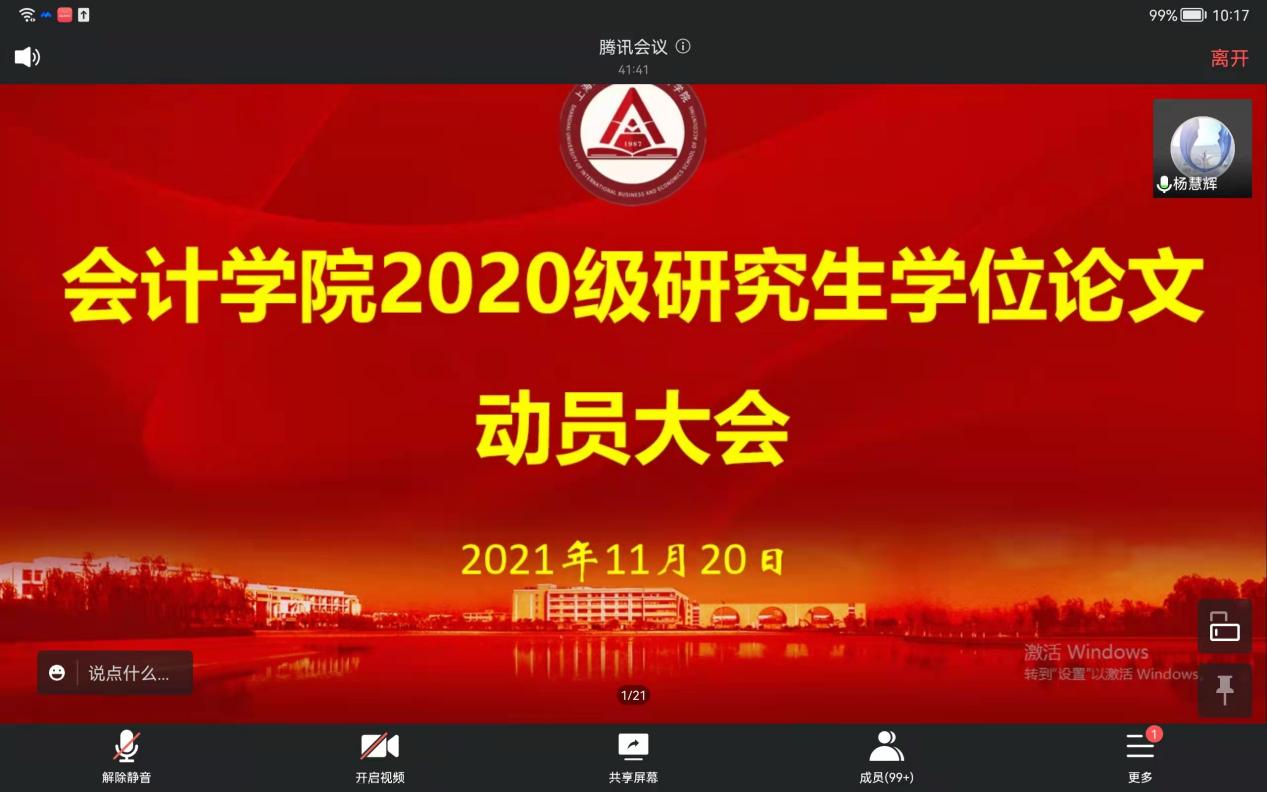 为进一步深化我院研究生教育综合改革,规范研究生教育管理和教育教学工作,加强研究生培养过程管理,推动研究生科学道德与学风建设,营造良好的科研学术氛围,不断提高我院研究生培养质量和学位论文质量,学院于11月20日上午通过腾讯会议召开了“弘扬学术诚信,涵养优良学风”2020级研究生学位论文动员大会。学院副院长杨慧辉、MPAcc中心副主任谭海桢、研究生辅导员朱红艳和2020级全体研究生参加了此次线上动员大会。