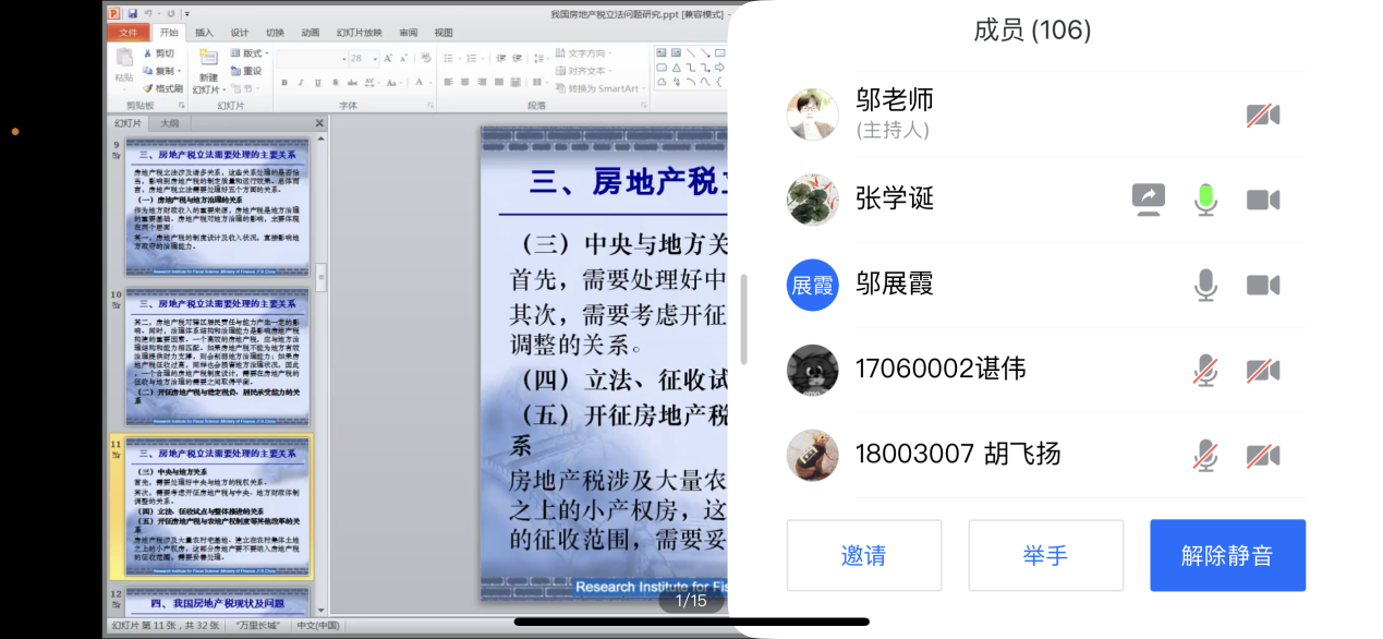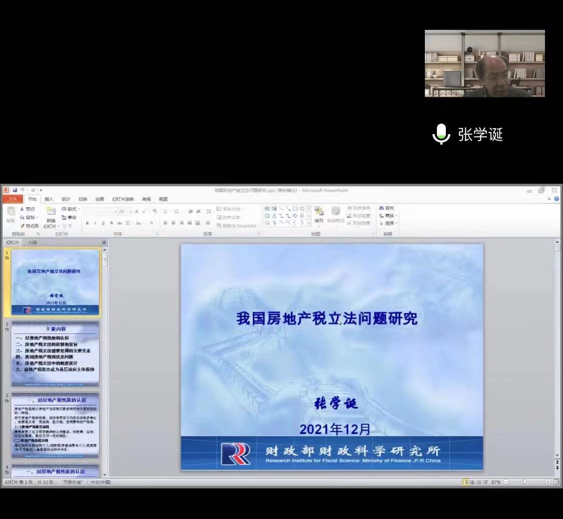 1211日下午,中国财政科学研究院公共收入研究中心主任张学诞先生通过腾讯会议面向我院学生开展了一场主题为“我国房地产税立法问题研究”的讲座张学诞先生曾入选国家百千万人才工程,授予“有突出贡献中青年专家”荣誉称号担任中国财政学会常务理事、中国财政科学研究院学术委员、北京财政学会理事、中国税务学会学术委员、国际税收研究会学术委员,现挂职于广西财政厅党组成员。本次讲座由会计学院教授邬展霞老师主持学院近百名学生在线聆听了这场讲座