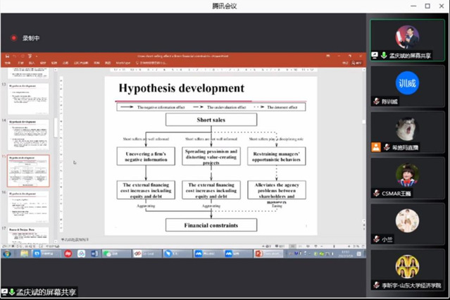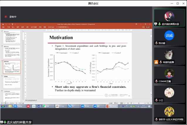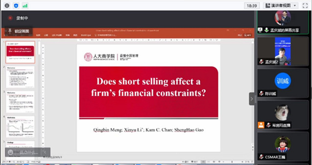 面对新冠疫情突袭申城的严峻形势,为了给疫情封控中的学子们及时送去精神食粮,营造疫情阴霾下的别样学术氛围,3月19日上午,中国人民大学商学院财务金融系孟庆斌教授应邀通过bilibili直播间与我院研究生“云”端相聚,向同学们分享和解读了他发表在Journal of Corporate Finance的论文《卖空会影响公司融资约束吗》。学院近百名研究生在线聆听了本次讲座。
