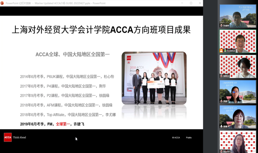 4月27日,裴瑱院长、孙淑伟副院长、吴蔚老师、曹亚楠老师以及ACCA华中地区负责人朱晓云女士等召开线上ACCA项目合作沟通会议。朱晓云女士主持了会议。ACCA上海办公室的Marine女士率先介绍了ACCA在全球和在中国的发展历史与现状,目前ACCA在中国已有会员和学员近19000人,认可雇主涵盖外企、国企、民企350余家,目前已是在全球认可度很高的专业组织机构。