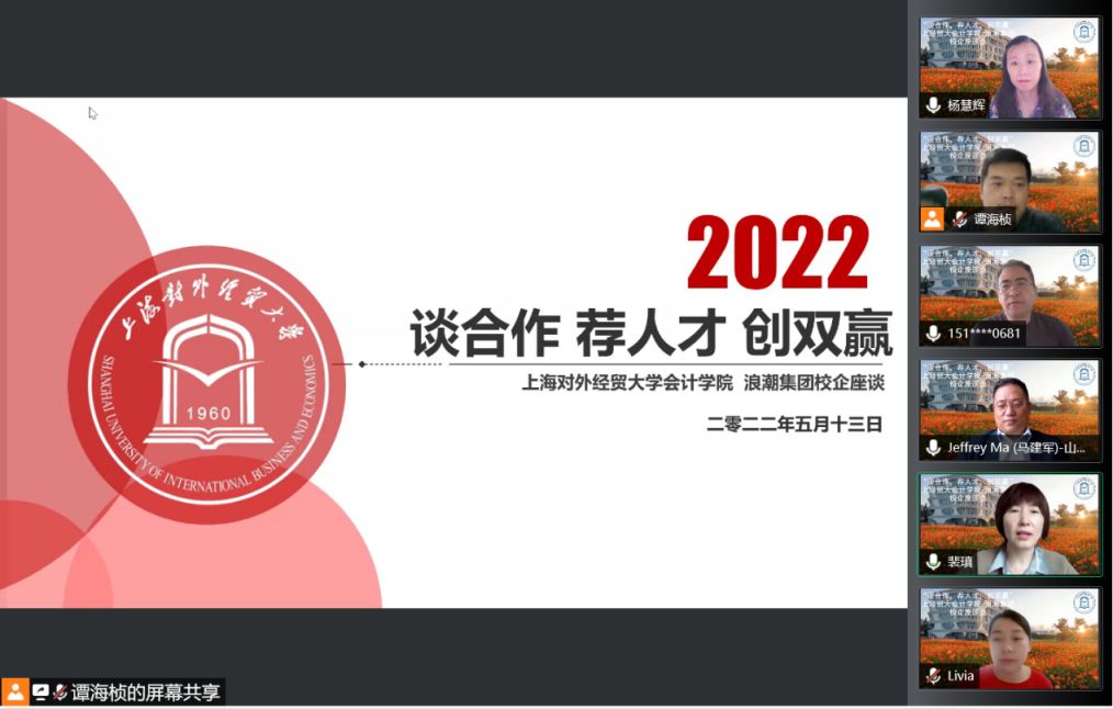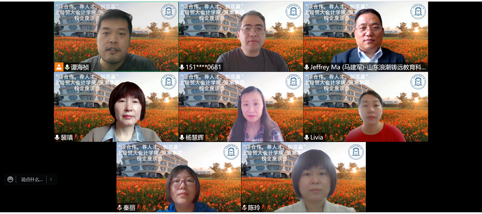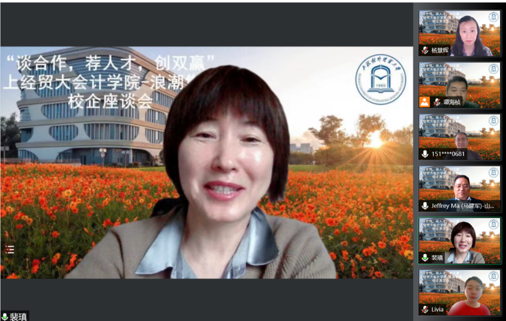 为贯彻落实党中央、国务院关于高校毕业生就业工作的决策部署,落实教育部关于全国高校书记、校长访企拓岗促就业专项行动,落实学校关于开展院长、书记访企拓岗促就业专项行动的通知,深入落实学院就业工作“一把手”工程,会计学院于5月13日,邀请浪潮集团进行了在线洽谈,双方就深化产学研合作、共同推动学生就业展开商讨。浪潮铸远教育科技有限公司总经理马建军、副总经理秦丽、副总经理陈玲、浪潮集团上海公司副总项学乐、客户经理卢筱丽,会计学院院长裴瑱教授、副院长杨慧辉教授、MPAcc中心副主任谭海桢出席了本次洽谈。