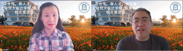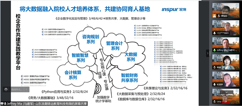 为贯彻落实党中央、国务院关于高校毕业生就业工作的决策部署,落实教育部关于全国高校书记、校长访企拓岗促就业专项行动,落实学校关于开展院长、书记访企拓岗促就业专项行动的通知,深入落实学院就业工作“一把手”工程,会计学院于5月13日,邀请浪潮集团进行了在线洽谈,双方就深化产学研合作、共同推动学生就业展开商讨。浪潮铸远教育科技有限公司总经理马建军、副总经理秦丽、副总经理陈玲、浪潮集团上海公司副总项学乐、客户经理卢筱丽,会计学院院长裴瑱教授、副院长杨慧辉教授、MPAcc中心副主任谭海桢出席了本次洽谈。