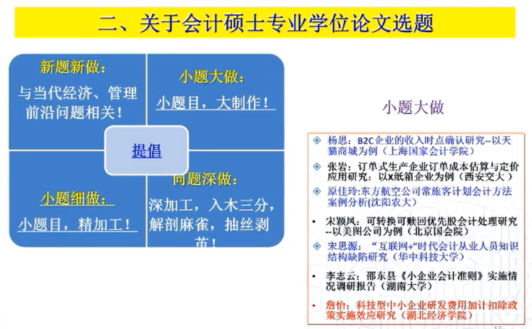 接着,张教授对会计硕士专业学位论文选题提出了六点建议:一是学生自选题目,导师审定;二是选题围绕会计学科;三是联系实际,可考虑新题新做,小题大做,小题细做,同题深做;四是不提倡纯学术;五是题目明确,一般为15-25个字;六是开题报告及答辩,要求将不好的选题及不符合要求的开题报告及时终止。他通过选取不同学科的专业学位论文,对MPAcc、Maud、MBA及MPA的典型论文选题进行辨析,强调要重视会计硕士专业学位论文的定位与边界,把握好论文选题的边界,要与培养目标和培养方向相契合。