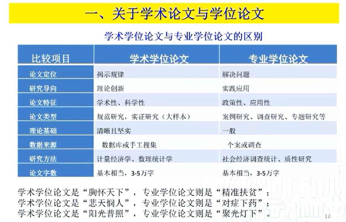 张教授首先就学术论文与学位论文的区别进行了解读,从论文定位、研究导向、论文特征、论文类型、理论基础、数据来源、研究方法及论文字数几个维度对两者之间的区别进行深入分析。他表示,学术学位论文往往得出的是一个普适性规律,而专业学位论文则是针对某企业的特定问题进行深入剖析并提出解决方案。