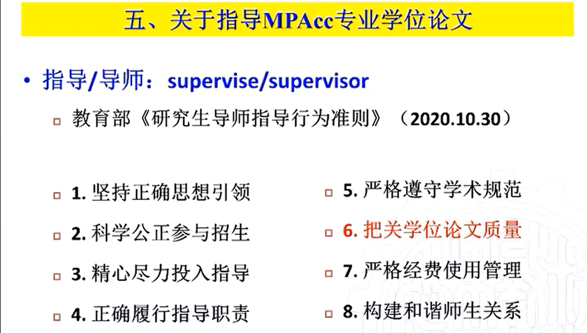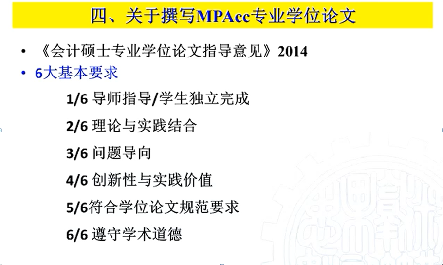 最后,张教授重点强调了MPAcc论文的质量亟待提升,具体包括六个维度:有明确的的定位、有先进的培养方案、有满足专业学位人才培养的校内外师资团队、有勤奋钻研的优质生源、有适当的研究方法与论文写作课程训练、有严格的质量控制机制。他认为一篇好的专业学位论文需要满足选题新颖、结构合理、理论充实、逻辑严谨、数据详实、方法科学、结论可靠、应用性强的要求。