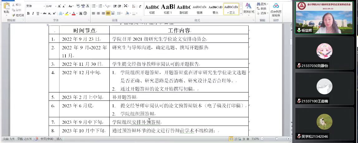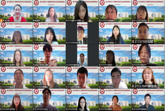 杨慧辉教授向2021级研究生详细解读了《上海对外经贸大学会计学院硕士学位论文质量管理办法(试行)》,梳理了学院关于2021级硕士研究生学位论文的工作程序和日程安排,并对研究生开展了关于学术道德与学术规范教育。她希望同学们树立正确的学术道德价值观,将一丝不苟、严谨治学的求实精神发扬在学位论文选题、撰写的全过程,强调学位论文应当紧贴专业和研究方向,要突出问题意识,注重选题基于国家战略需求和社会关切、研究设计的科学性、行文的学术规范性;同时还要在学位论文的撰写中注意把控好各个时间节点,合理做好时间规划,以知促行,以行促知,打磨出一篇经得起检验的高质量硕士学位论文。