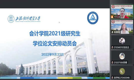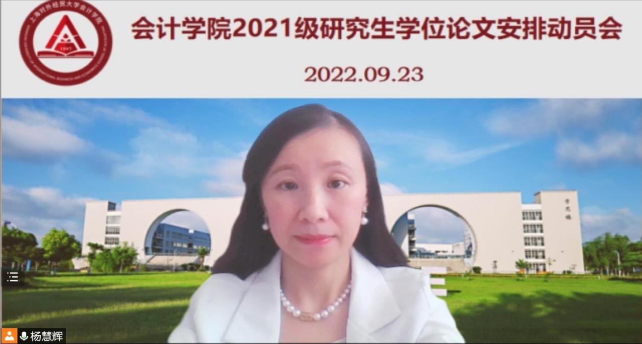 杨慧辉教授向2021级研究生详细解读了《上海对外经贸大学会计学院硕士学位论文质量管理办法(试行)》,梳理了学院关于2021级硕士研究生学位论文的工作程序和日程安排,并对研究生开展了关于学术道德与学术规范教育。她希望同学们树立正确的学术道德价值观,将一丝不苟、严谨治学的求实精神发扬在学位论文选题、撰写的全过程,强调学位论文应当紧贴专业和研究方向,要突出问题意识,注重选题基于国家战略需求和社会关切、研究设计的科学性、行文的学术规范性;同时还要在学位论文的撰写中注意把控好各个时间节点,合理做好时间规划,以知促行,以行促知,打磨出一篇经得起检验的高质量硕士学位论文。