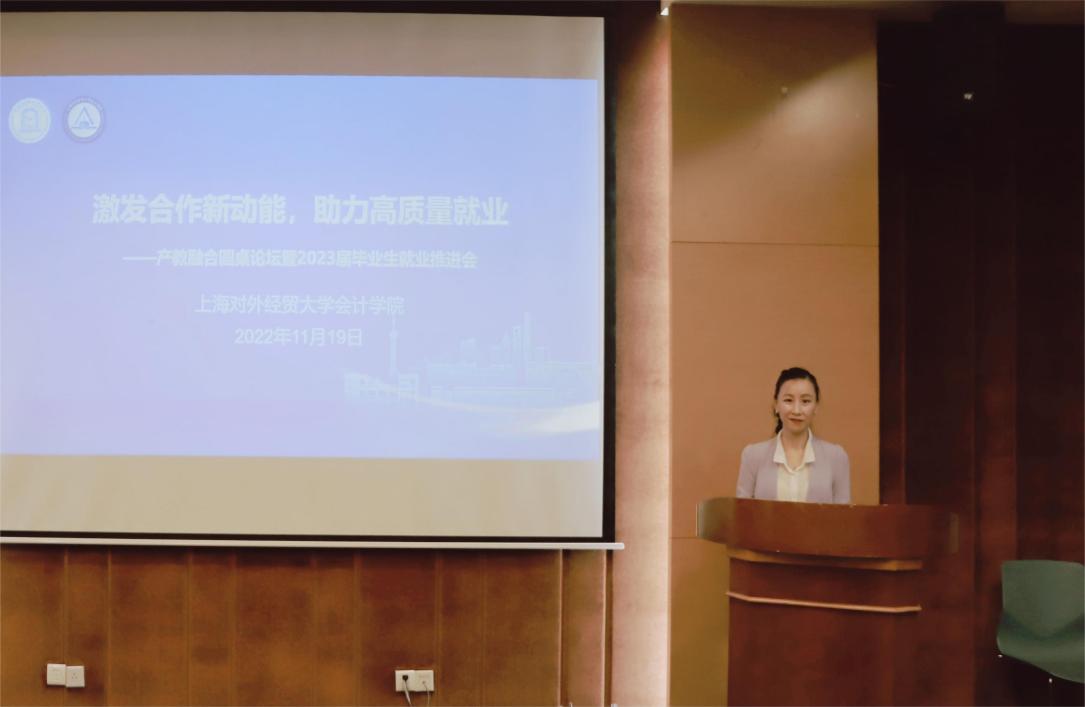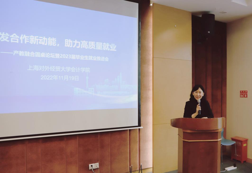 11月19日下午,“激发合作新动能·助力高质量就业”——会计学院产教融合圆桌论坛暨2023届毕业生就业推进会在上海虹桥国际会议中心顺利举办。学校办公室主任、会计学院党委书记张嵘,会计学院院长裴瑱,副院长张天舒、杨慧辉、孙淑伟和学院教师代表以及来自20家用人单位的31位企业导师和HR出席会议。会议由会计学院党委副书记施毅婷主持。