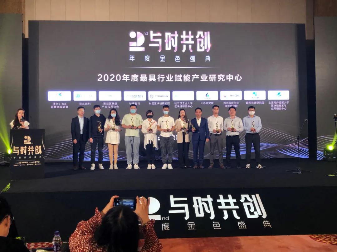 2020年12月26日,由金色财经主办,STD盛大公链总冠名,量子矿池、雷神公链、CYPHERIUM联合呈现的“与时共创”第二届年度金色盛典在三亚海棠湾洲际酒店拉开帷幕。活动现场对2020第二届金色财经年度榜单公布“2020年度最具行业赋能产业研究中心”进行颁奖,获奖单位包括:清华x-lab区块链实验室、火币研究院、哈尔滨工业大学区块链研究中心、上海对外经贸大学人工智能与变革管理研究院-区块链技术与应用研究中心、欧科云链研究院、树图区块链研究院、京东数科、链塔智库、南京区块链产业应用协会、郑州国研创业经济研究院。