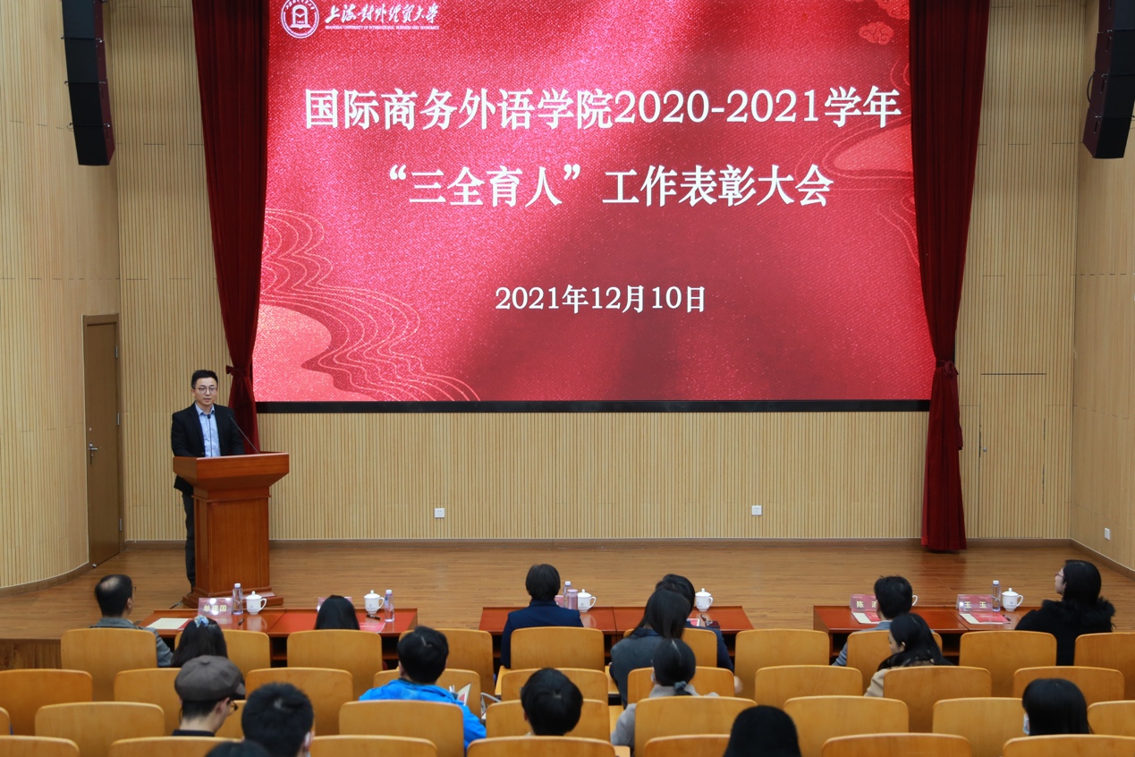 12月10日,国际商务外语学院在思源报告厅隆重举行2020-2021学年“三全育人”工作表彰大会。学院1992级英语专业校友、玮仕集团董事长陈添,学院党委书记刘根春,院长温建平,校研工部副部长乔檀,副院长王玉、单建国,玮仕集团副总裁李燕、课程研发与运营总监鲁毓倩,博雅年度“三全育人”系列获奖代表、专业主任、教研室主任、辅导员、学生代表等参会。大会由学院党委副书记徐峰主持。