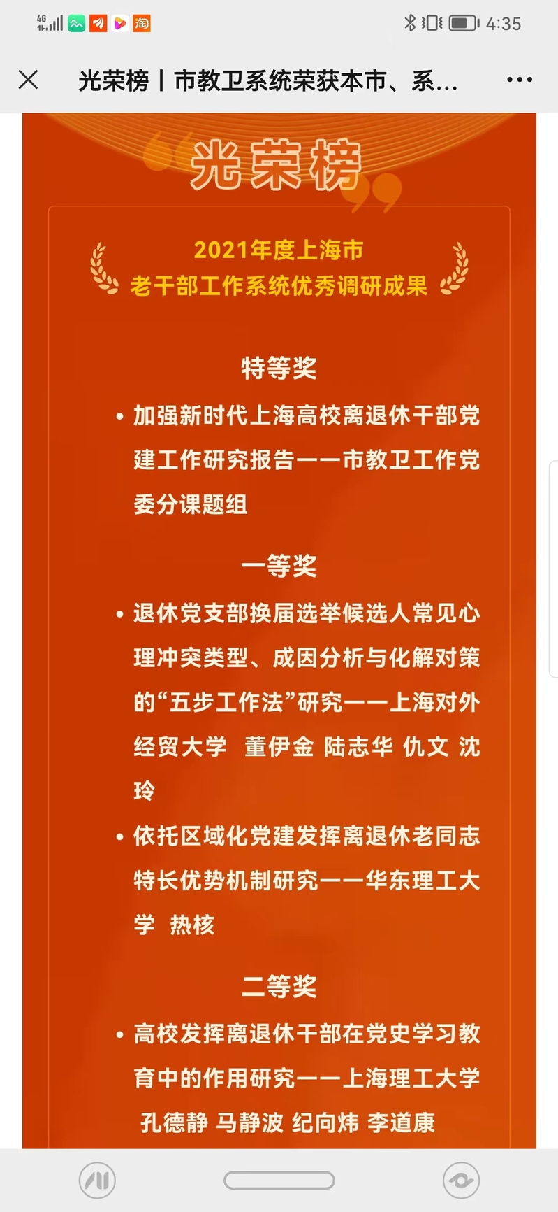 日前,由学校离退休党委、老干部办公室董伊金、陆志华、仇文、沈玲合作撰写的调研课题《退休支部换届选举候选人常见心理冲突类型、成因分析与化解对策的“五步工作法”研究》在前期获得2021年度上海市教卫系统老干部工作优秀调研课题一等奖的基础上,再次获得2021年度上海市老干部工作系统优秀调研成果一等奖。