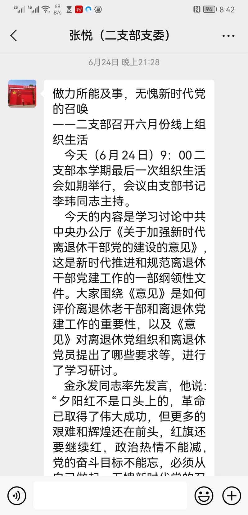 因为疫情原因,离退休党委继续组织支部以线上交流的方式开展组织生活,并下发了学习材料,着重围绕《意见》对支部工作和党员提出了哪些要求而展开,在党员中产生了积极反响。退休二支部以“做力所能及事,无愧新时代党的召唤”为主题展开讨论,有11位老同志积极参与发言,每位同志发言后都有其他同志的点赞评论等互动。退休三支部有9位老同志递交了发言材料,其中手机打字不方便的陈欣老师手写了学习心得拍照上交。退休五支部支委带头交流,并结合疫情中做志愿者的情况谈了如何发挥离退休党员作用的感想。