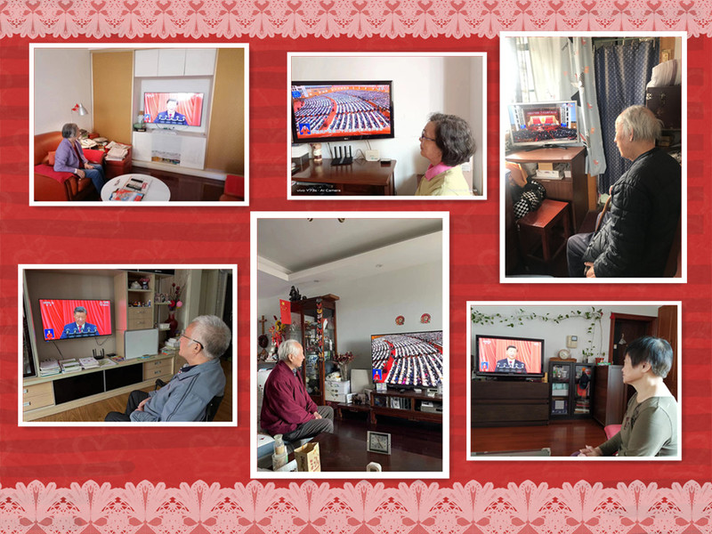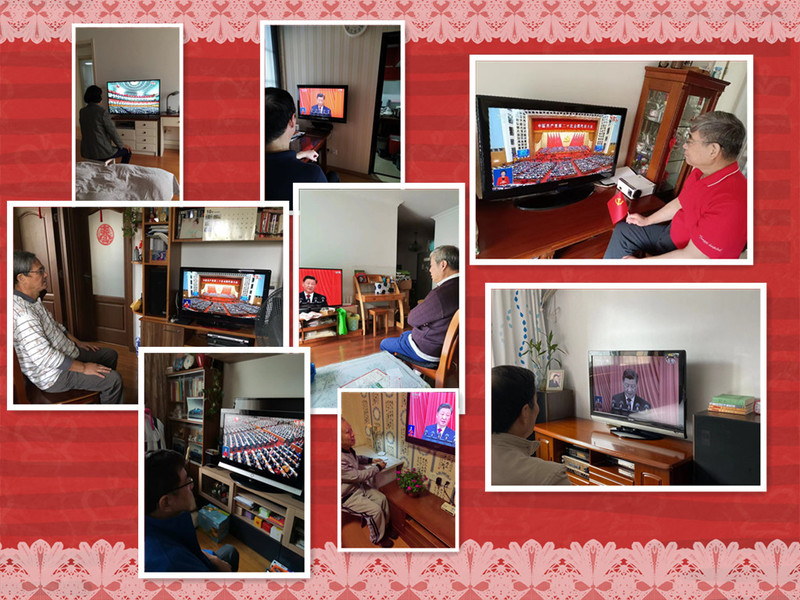 离退休党委成员在组织好离退休支部学习的同时,自己不忘先学一步,五位离退休党委委员都在聆听习近平总书记报告后,第一时间交流了心得体会。退休党员们也早早等候在电视、电脑和手机端前,同步收看开幕式并在离退休党委支部工作群和本支部群分享了各自的心得。截止到晚上六点,五位党委委员和支部党员皮耐安、莫怡、陶影影、张璐、沈振康、李邦君、陈春松、黄玮、龚文祥、宋海燕、王铮、朱龙妹、王勇、母天学、金基宁、朱淑英等老同志相继分享了自己的体会,得到群里其他老同志的啧啧称赞和高度认同。毛丽珍、殷月丽、张悦、徐黎萍、程林妹、潘龙飞、马茂才、张菊娣、陈国强、金基宁、李爱国、薛宝金、周林娟、周行健、朱荣康、杨淑娥等老同志也纷纷提交了收看实况的照片。
