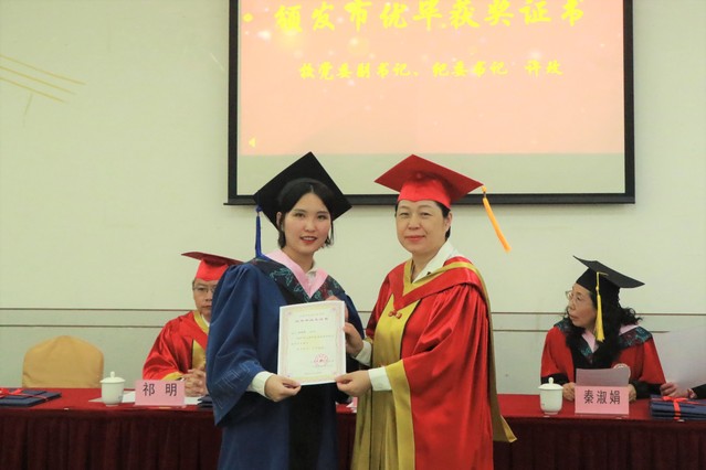 校党委副书记、纪委书记许玫为上海市优秀毕业生赵晓慧颁发获奖证书。