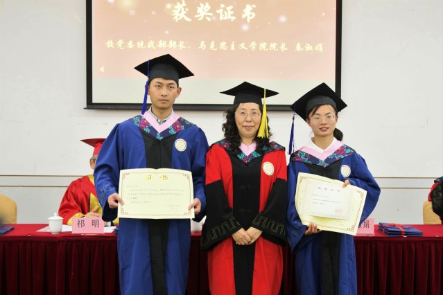 校党委统战部部长、马克思主义学院院长秦淑娟为校优秀毕业生、校优秀硕士学位论文获奖学生陈梦瑶、霍廷然颁发获奖证书。
