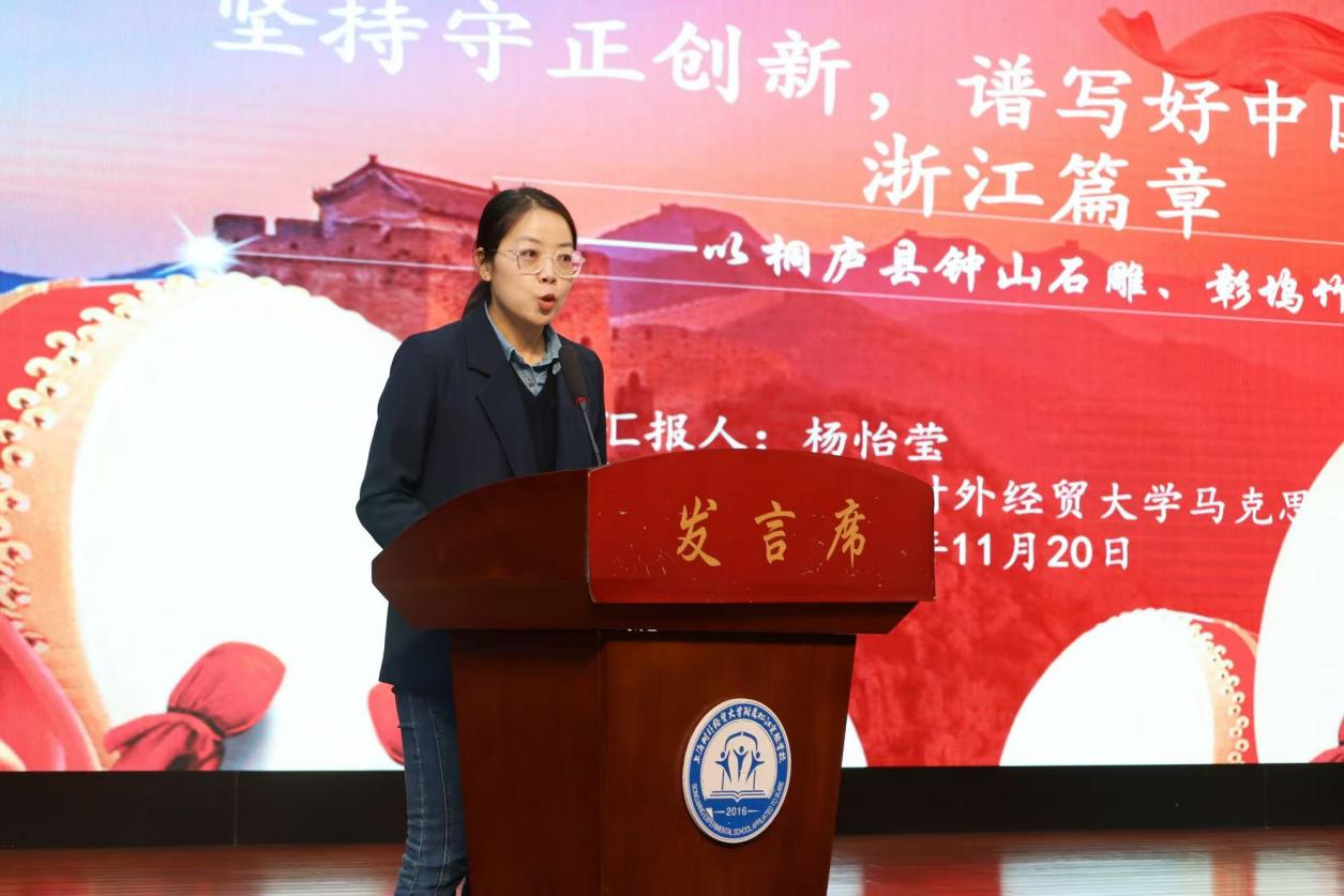 “结合本次暑期专项社会实践,我的认识主要分为两个方面,第一部分是传统非遗焕发的时代魅力,第二部分是守正创新推进中国式现代化行稳致远。并且要更加深刻地理解“两个结合”,从中华文化到中国特色社会主义,再到今天习近平新时代中国特色社会主义思想的创立和实践,其中内蕴的一以贯之的实质就是马克思主义的中国化时代化,就是马克思主义基本原理同中国具体实际相结合,同中华优秀传统文化相结合。”上海对外经贸大学马克思主义学院杨怡莹老师在分享会上这样说道。