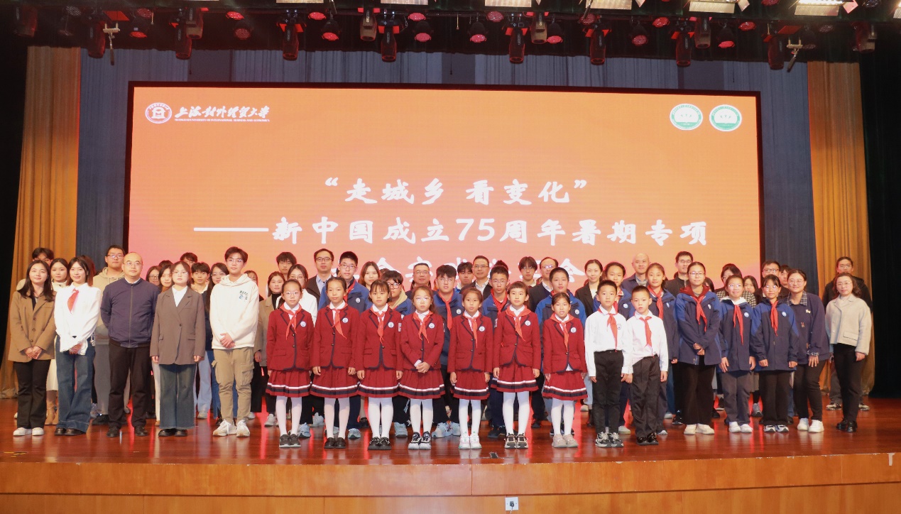 11月20日,由上海对外经贸大学校团委与马克思主义学院联合举办的“走城乡,看变化”——新中国成立75周年暑期专项社会实践分享会在上海对外经贸大学附属松江实验学校思源剧场顺利举办。上海对外经贸大学副校长徐永林、校教务处处长朱建明、校党委学工部副部长、团委书记司徒力云、马克思主义学院党委书记刘海泉、马克思主义学院党委副书记张帅、马克思主义学院副院长罗国辉、松江区教育局宣传德育科副科长孙荟涵、上经贸大附校校长陈伟平、上经贸大附校花园分校专职副书记高丽红、上经贸大附校及花园分校副校长程栋出席会议。会议由张帅主持,社会实践大中小学生团队代表及喀什大学实践团队师生代表线上线下共同参与分享会。