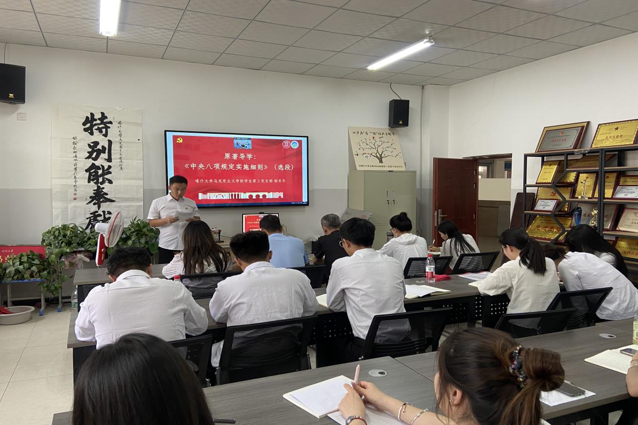 在理论深学环节,上海对外经贸大学马克思主义学院学生第一党支部王馨玮、喀什大学马克思主义学院学生第三党支部杨肖冬分别领学《反对本本主义》及《中央八项规定实施细则》选段,带领广大党员同志读原著,感悟经典著作的深刻内涵。