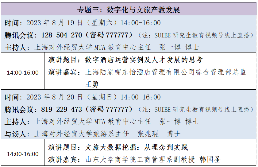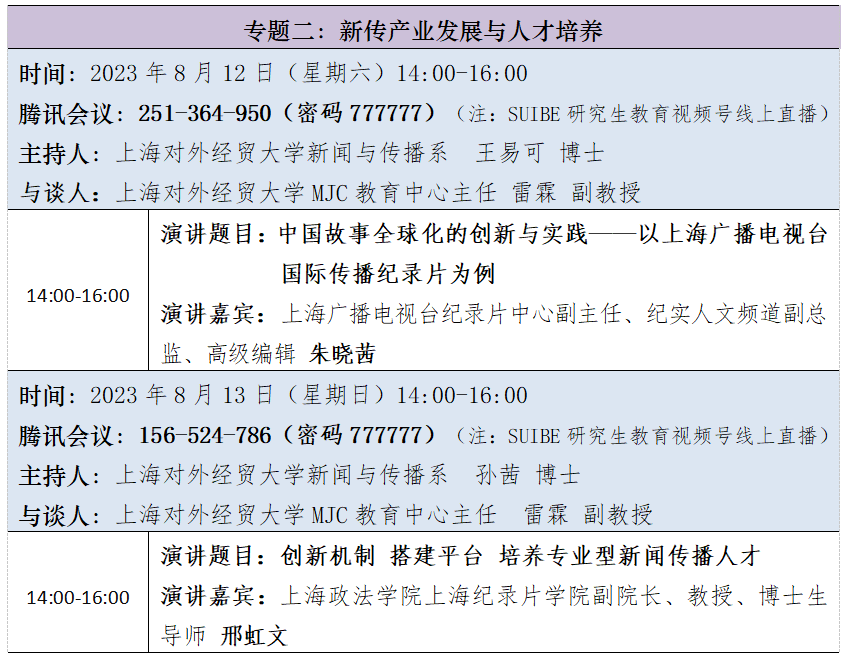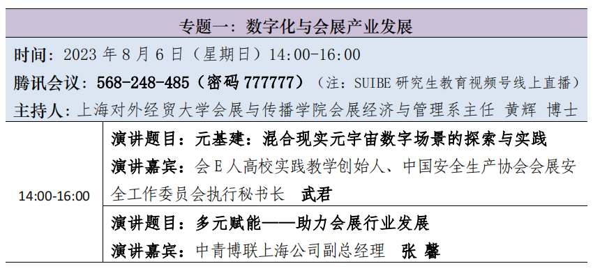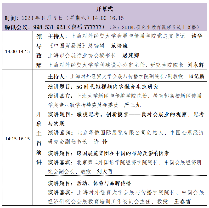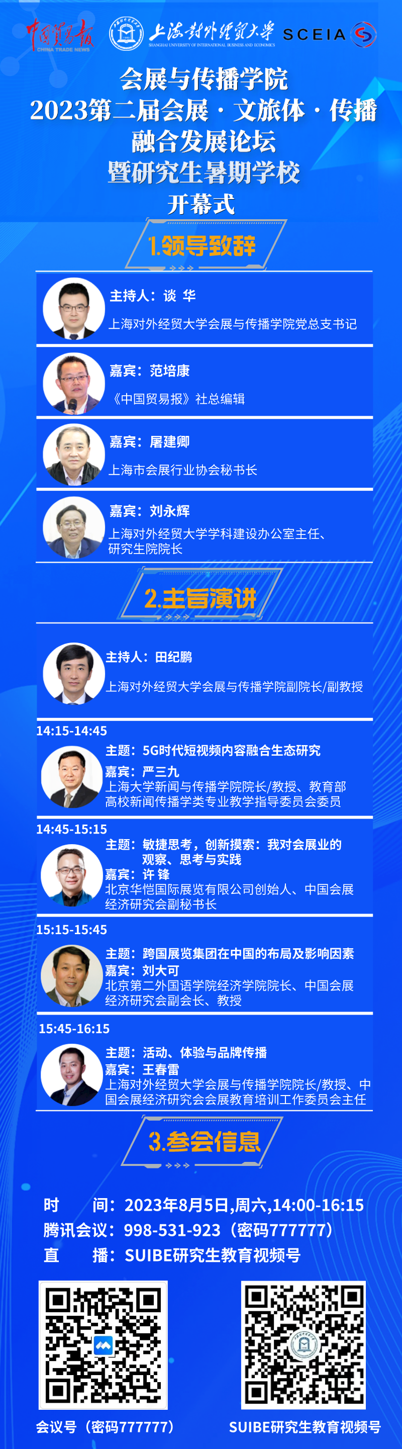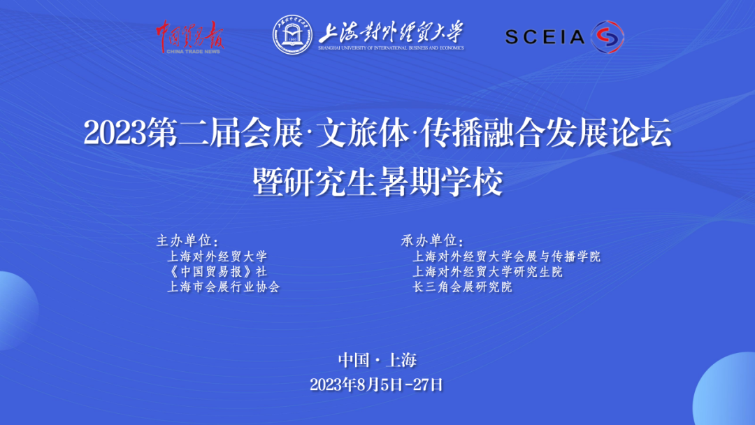 2023第二届会展•文旅体•传播融合发展论坛暨研究生暑期学校即将于8月5日14:00举行开幕式和论坛主旨演讲,整个活动持续到8月底,敬请关注。