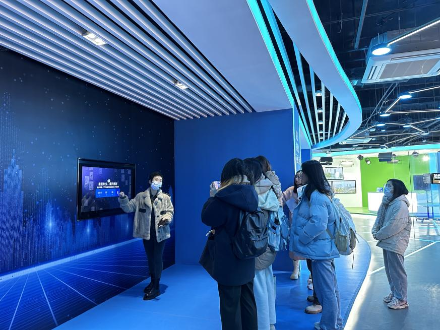 在讲解员的带领下,师生们探秘松江融媒体中心,先后参观融媒体中心展厅、电视演播厅、可视化直播间、以及指挥大厅等工作地点,了解松江融媒体中心在媒体融合方面的成功探索,其微信公众号“上海松江”曾荣获全国县融中心优秀案例。通过参观,同学们了解了媒体内容生产的流程,也对当前媒体深度融合背景下主流媒体的发展方向有了更深刻的认识。