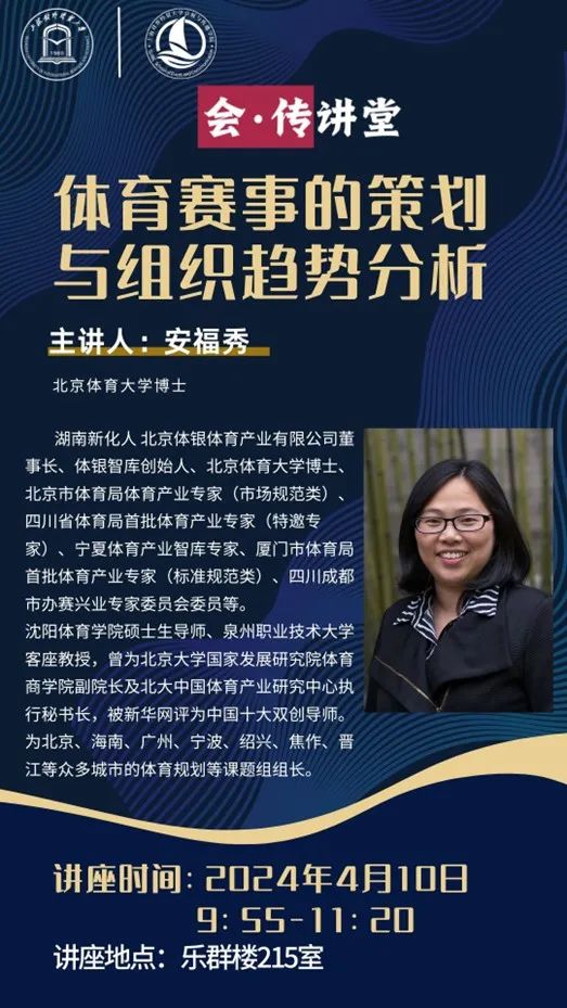 安福秀介绍了体育产业的重要性和发展潜力,尤其自2014年国务院发布关于加快发展体育产业的政策文件以来,体育产业经历了快速的发展和多个阶段的演变。她指出体育产业是一个多元化的产业,包括体育用品、体育服务、体育休闲健身等,并指出体育赛事领域尽管直接的经济产出不如金融等行业领域,却能撬动大量资源。此外,她强调了策划和创意在体育赛事中的重要性,提到了需要头脑风暴和创新性的想法来策划和组织成功的体育赛事,并介绍了体育赛事的商业价值、如何通过赛事提升品牌价值、如何通过赞助和广告等方式实现盈利等行业经验。讲座最后,安福秀提到了体育会展作为新兴的行业,具有很大的发展潜力。体育赛事可以作为会展的一个重要场景,提供丰富的体验和展示机会,并且强调了在体育产业中如何培养和提升人才的设计和策划能力。