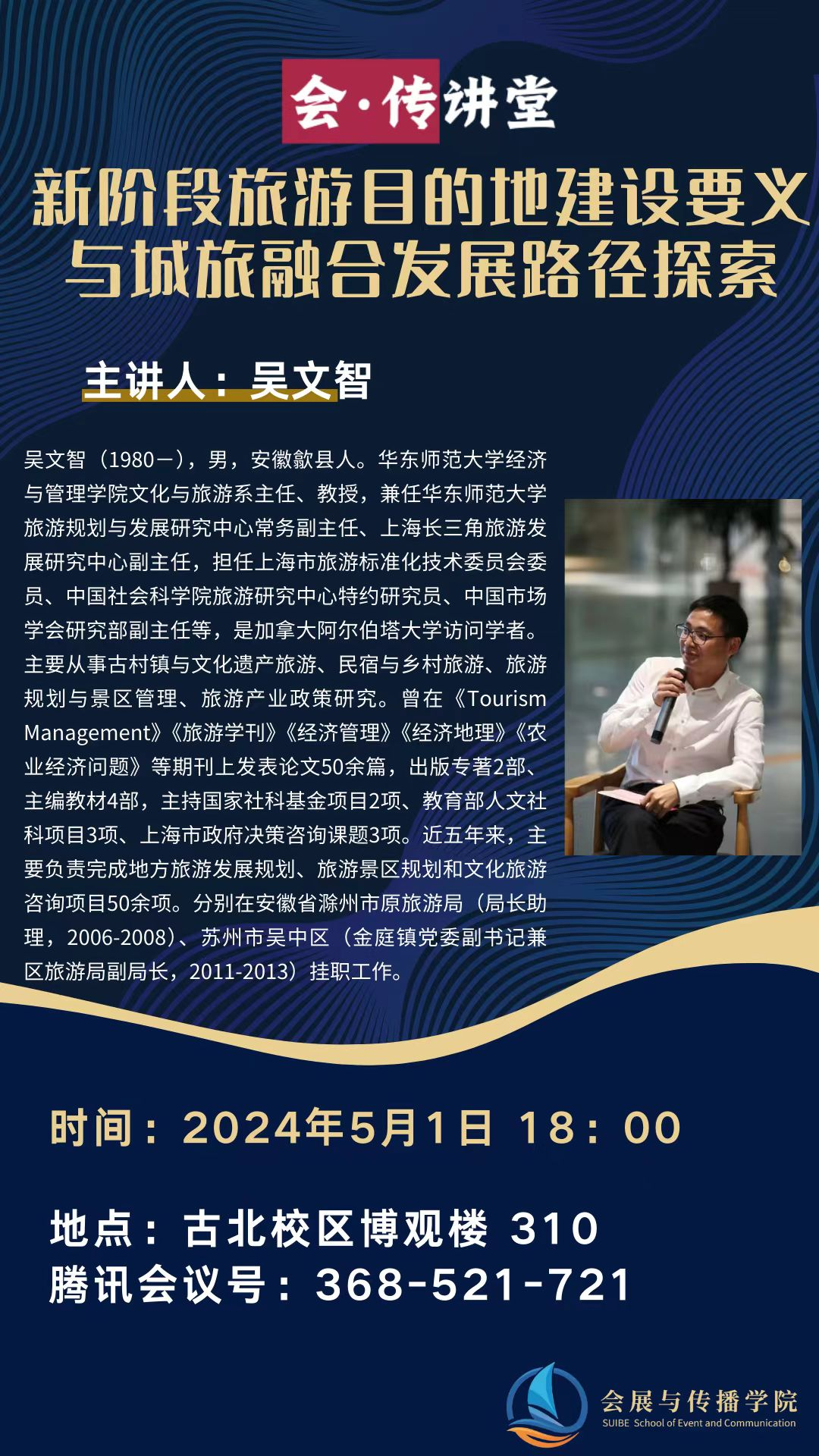 为强化学生对旅游目的地管理中多要素、多主体、多目标的内涵理解,会展与传播学院于2024年5月1日邀请华东师范大学经济与管理学院文化与旅游系主任吴文智教授带来题为《新阶段旅游目的地建设要义与城旅融合发展路径探索》的主题讲座。2023级MTA非全日制全体研究生线下参与,本次讲座由全华教授主持。