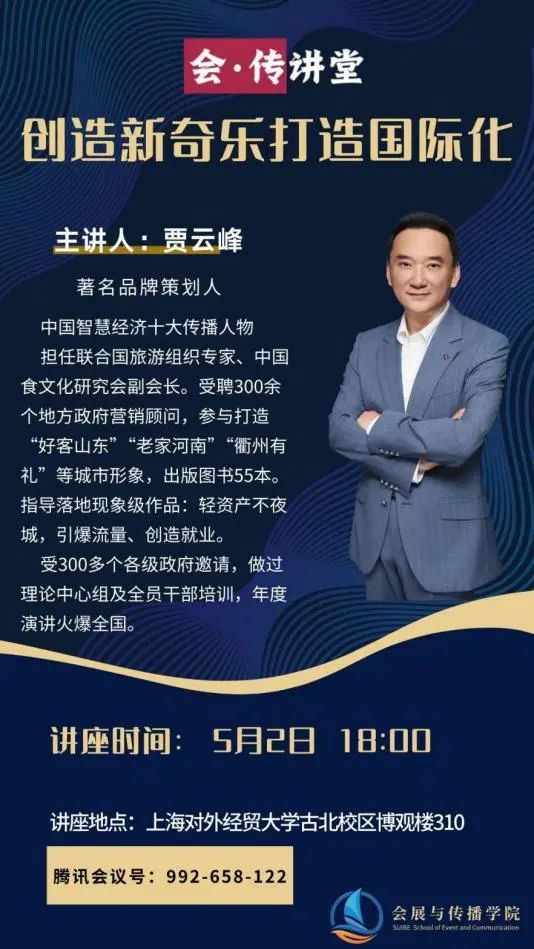 为强化研究生培养理论实际相结合,做到学有所用、学以致用,会展与传播学院于2024年5月2日邀请著名品牌策划人、中国智慧经济十大传播人物、联合国旅游组织专家、上海对外经贸大学客座教授贾云峰教授带来题为《创造新奇乐,打造国际化》的主题讲座。2023级MTA非全日制全体研究生线下参与,本次讲座由全华教授主持。