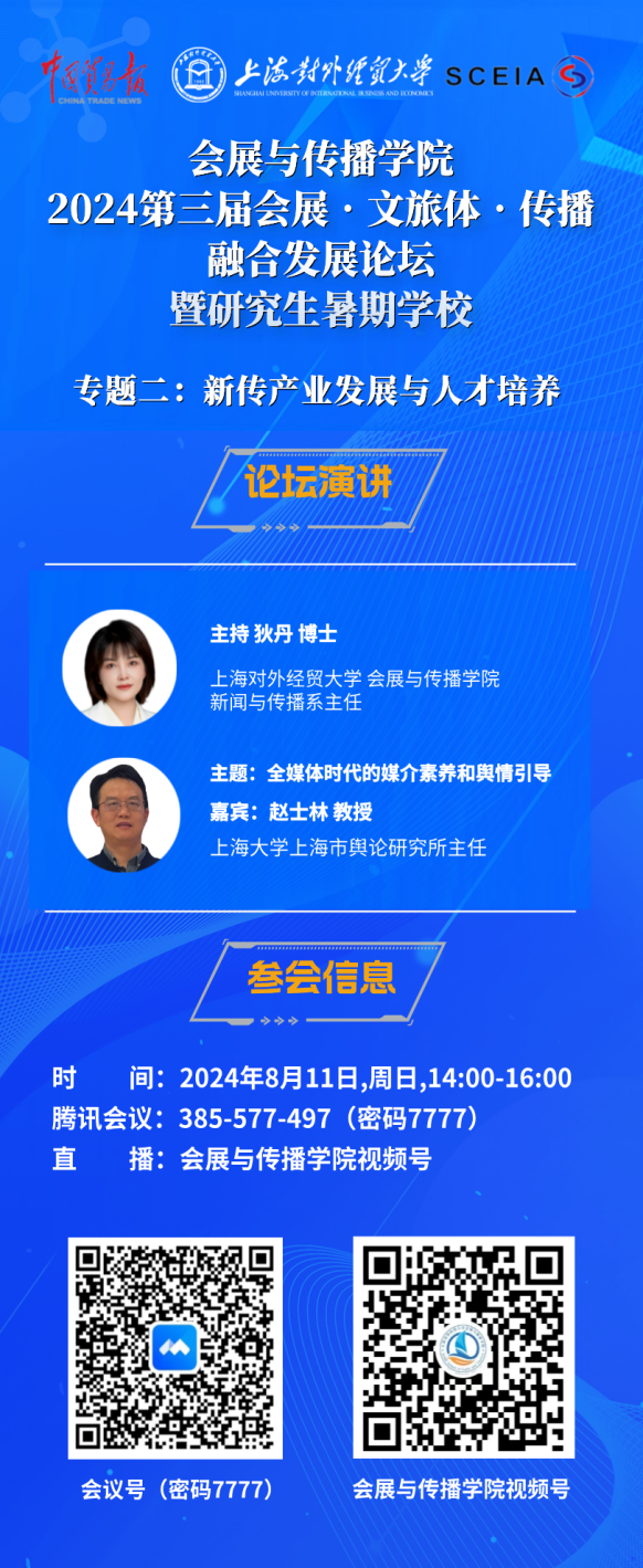 8月11日,由上海对外经贸大学、《中国贸易报》社和上海市会展行业协会主办,上海对外经贸大学会展与传播学院、上海对外经贸大学研究生院和长三角会展研究院承办的2024第三届“会展·文旅体·传播”融合发展论坛暨研究生暑期学校的“专题二:新传产业发展与人才培养”第二场论坛主题讲座在线顺利举行。上海大学上海市舆论研究所主任赵士林教授担任演讲嘉宾,论坛由上海对外经贸大学会展与传播学院新闻与传播系主任狄丹博士主持。