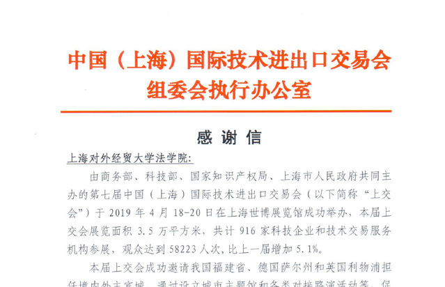 近日,中国(上海)国际技术进出口交易会向上海对外经贸大学法学院发来感谢信,对学院在志愿者组织、服务方面的大力支持表示衷心感谢,对志愿者的奉献精神和服务水平表示赞扬。