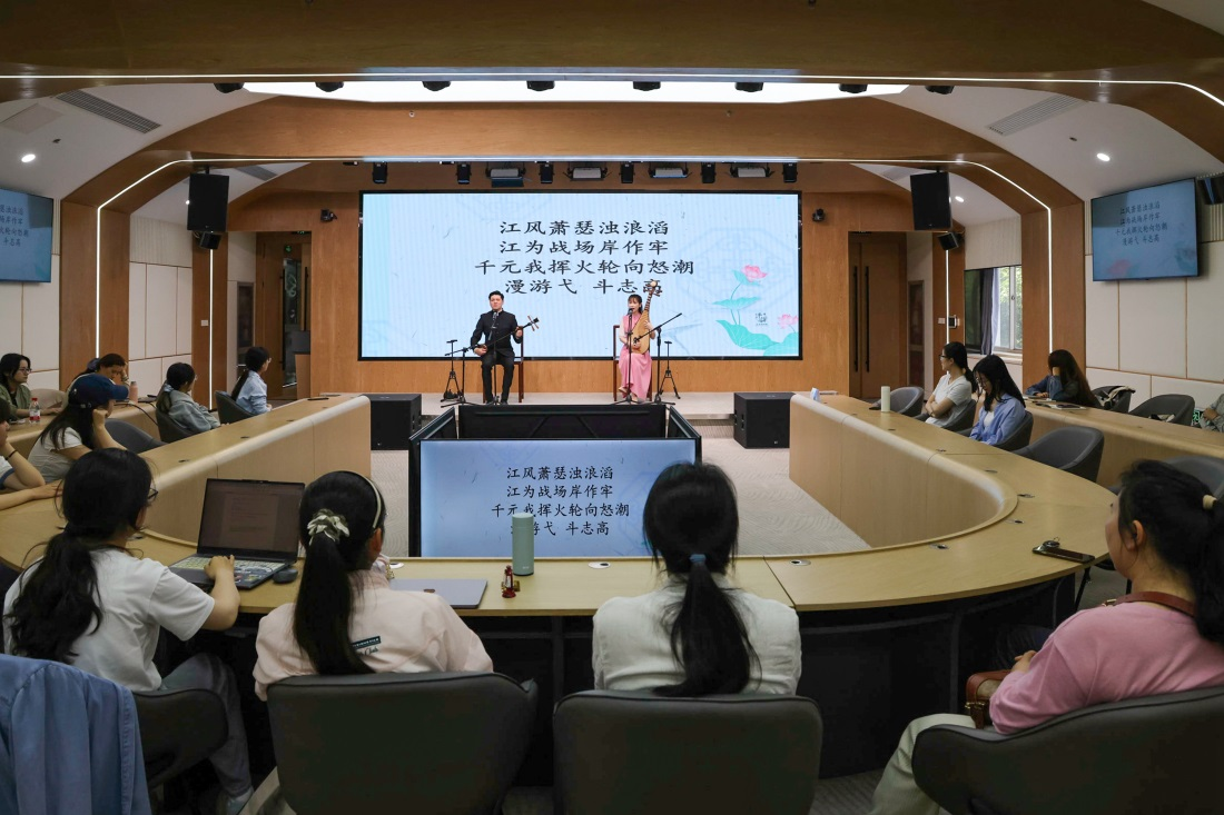 “苏州评弹是观察江南社会的窗口。”高博文团长为大家详细讲解了评弹的历史渊源、特色和艺术魅力。姚依依以一曲《江南好风光》开场,吴侬软语间勾勒出烟雨楼台的江南韵致。姜啸博在《莺莺操琴》中以“长日夏凉风动水,凉风动水碧莲香”的婉转唱词,应和了夏景不寻常的当下。陆嘉玮与朱琳以《杨八姐·比武》将演出推向高潮,铿锵琵琶伴着手眼身法,展现了评弹的表现张力。当陆嘉玮携姚依依演绎《千里江山图·对望》时,男女声腔交织,红色文化与江南风骨交融,革命者的家国情怀通过评弹特有的“说中带唱、唱中带演”方式娓娓道来。最后,高博文团长以蒋调《天长地久永不分》压轴,将白蛇传说的千年痴缠揉入现代编曲,实现了传统与现代音乐的完美碰撞。