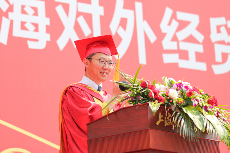 Vice Presidents XuYonglin and Wu Zhong announced the 2021list of bachelor's, honorary bachelor's and master's degrees to be awarded and a decision on honoring outstanding graduates of Shanghai and SUIBE of the year, respectively. Mr. Wang Rongming issued authorization letters to the heads of all schools, authorizing them to hold their own degree conferment ceremonies of 2021. Li Zhuoning from the School of International Business and Economics and Professor Zhan Debin from the School of Law delivered speeches on behalf of the students and faculty respectively.