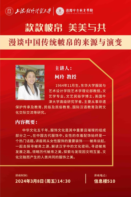 国际中文教育学院师生于38日共聚信息楼510,举办庆祝第114个“三八”妇女节的活动。本次活动的主题为“美哉‘巾’帼”,以中国传统服饰中的“帔帛”为线索,联系现代服饰中的“丝巾”,探索服装配饰的发展历史、传承渊源、使用功能与审美意蕴,在领略学习中华文化服饰之美中感悟当代妇女对美的向往和追求。