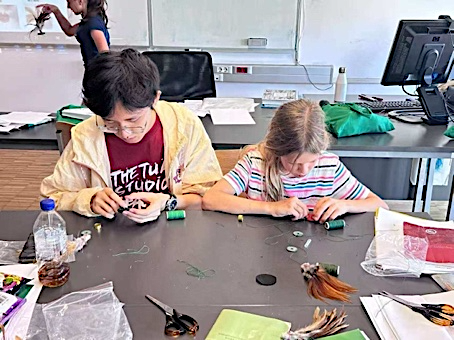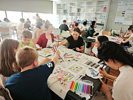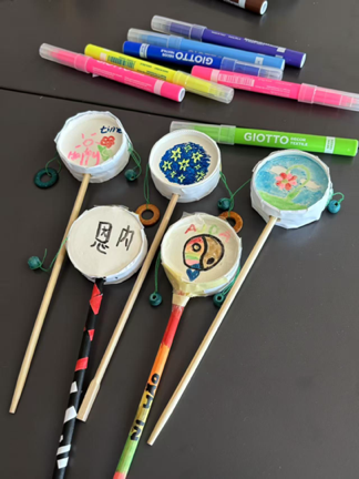 文化工作坊高潮迭起——学生们亲手扎制毽子,课后庭院自发练习的身影,是文化生根的生动注脚;团扇制作从千年历史讲起,孩子们执笔绘就熊猫、茉莉花,素白扇面绽放天马行空的东方美学;拨浪鼓DIY中,中国名字、太极八卦跃然鼓面,传统乐器焕发新生。