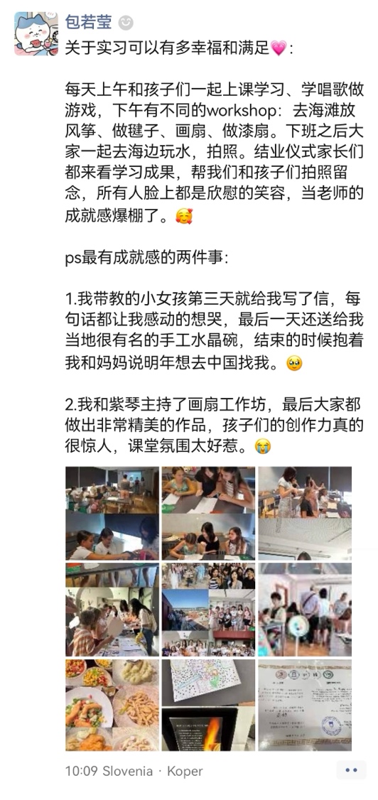 在本次科佩尔孔子课堂的海外实习中,上海对外经贸大学的学子们以语言为舟,以文化为帆。他们不仅夯实了国际中文教育的专业能力,更在亚得里亚海畔播下了友谊与理解的种子。孩子们学说“早上好”时的认真,挥舞彩绘团扇时的自信,齐唱中文歌时的快乐,都是这段旅程最珍贵的回响。当中国风拂过斯洛文尼亚的海岸,这群年轻的“文化使者”正以实际行动诠释着文明互鉴的深远意义,为共建“一带一路”民心相通之路,书写下独具一格的动人青春脚注。