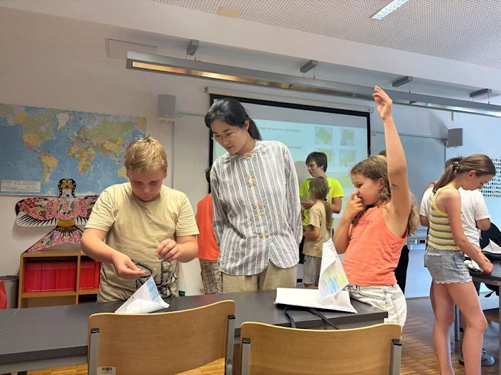 6月30日,在首次初级汉语班的课堂上,斯洛文尼亚当地汉语教师Katja(卡迪娅)负责课堂组织设计和知识串讲,海外实习团队的汉语小老师们则负责进行分组练习和知识巩固。Katja以汉字演变视频作为引入,通过“日、月、山”等象形字的动态展示,让孩子们充分感受到汉字的魅力。实习团队的汉语小老师们以汉字卡片、角色扮演等练习形式,让孩子们将知识现学现用。此次科佩尔孔子课堂海外实习,SUIBErs探索出了“一师串讲+多师陪练”的教学新模式,极大提高了海外儿童汉语课堂的学习效率。