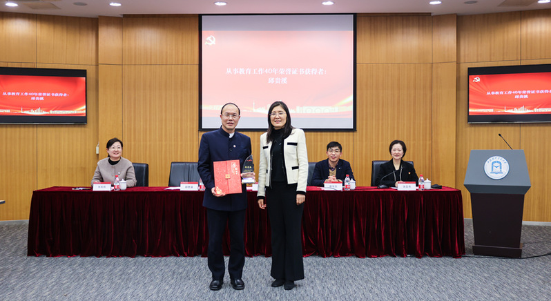 会上举行了教师表彰。姜秀珍为从教40年教师邱贵溪颁奖,唐旭生为2024年学院上报学校考核优秀的教师李涛、李敏颁奖,张莉莉为2024年学院考核优秀的教师朱昌言、顾巍颁奖。