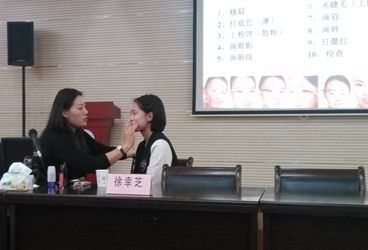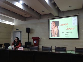 讲座邀请了东华大学服装设计与表演专业徐幸芝老师主讲。徐老师首先从理论上介绍了皮肤的概述、皮肤的构造、皮肤的衰老表现、皮肤的衰老原因、皮肤的类型划分。然后又从化妆的角度教授了肤色与服色的搭配原则、化妆品分类、化妆设计、化妆程序与式具选择、化妆步骤、职业妆特点。最后还与学生模特一起现场展示了生活妆的化妆过程。