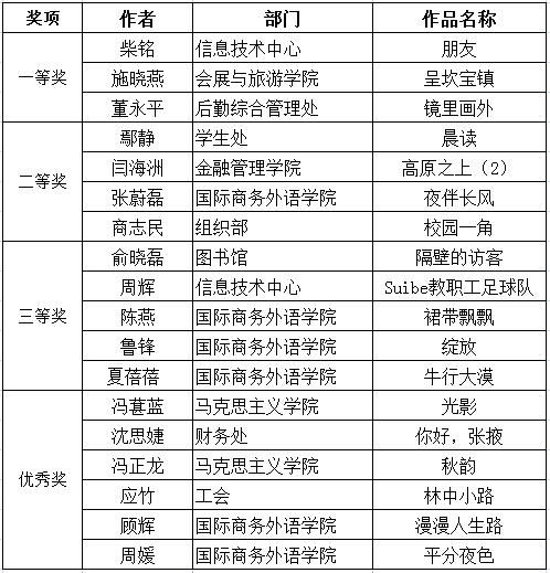 本次活动为摄影爱好者提供了一个摄影作品欣赏、摄影技术切磋、相互交流的平台。作品题材广泛、内容丰富、主题突出。校工会成立了专家评审小组,本着公平、公正、公开的原则,对所有作品进行了分类和匿名编号。经过评委们认真仔细评选,深入讨论后,评选出一等奖3名,二等奖4名,三等奖5名,优秀奖6名。获奖作品通过独特的视角,发现美,展现美,讲述了一幅幅五彩光影的故事,展现了广大教职工热爱生活、积极向上的精神风貌。