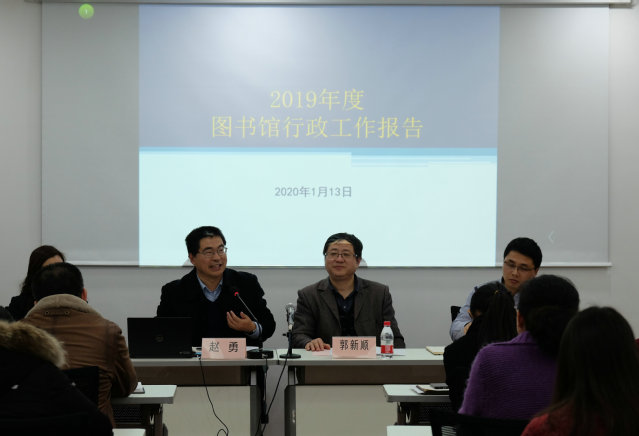 赵勇书记作了图书馆2019年行政工作报告,报告从文献资源建设、读者服务工作、新馆及古北馆建设、科研工作以及馆员队伍建设等方面,回顾和总结了图书馆在过去一年来所取得的成绩,同时向大会报告了2019年图书馆经费使用情况,并提出2020年的工作思路。对图书馆而言,2019年是具有历史纪念意义的一年,新图书馆如期落成并顺利搬迁开馆,同时阅读推广品牌建设不断夯实,新媒体平台服务逐步拓展,学科情报产品深入挖掘,馆员学术发展有序深化。回顾过去,展望未来,振奋人心,赵勇书记代表图书馆领导班子,向全体馆员在过去一年来为推动图书馆发展所做出的努力和贡献表示感谢。