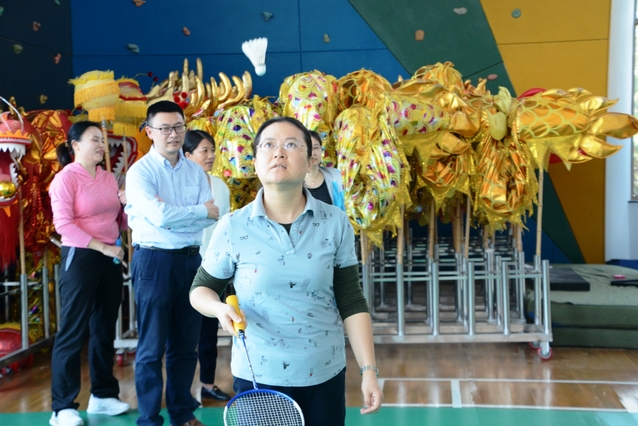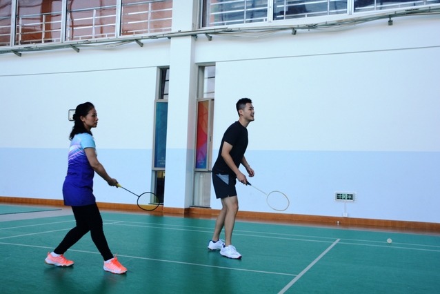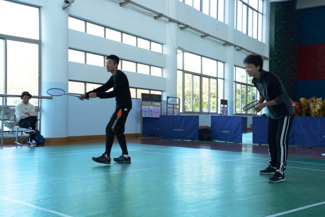 热身运动过后,便是受人瞩目的男女混双比赛,参赛的老师们两两组合,随机搭配,围观的老师和学生们加油喝彩,现场一片其乐融融。只见宋志刚老师凌空飞跃,以迅雷不及掩耳之势打出一个漂亮的吊球,将比赛带入拉锯战;隔壁球场上的李南雁老师也毫不示弱,一记钩球声东击西,巧妙得引诱对手上网,继而绝杀,博得满堂喝彩。赛况胶着而又持久,老师们纷纷使出浑身解数,将看家本事倾囊相交。