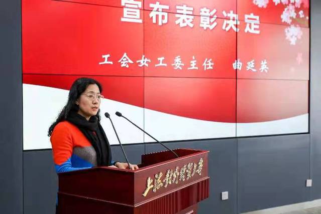 工会女工委主任曲延英宣读了《关于表彰2019—2020年度三八红旗手(集体)的决定》,齐佳音同志荣获“上海市教育系统三八红旗手”荣誉称号,闫辛、闫晶晶、张天舒、吴婷婷、庾向芳五位同志荣获“上海对外经贸大学三八红旗手”荣誉称号,后勤综合管理处门诊部、图书馆、法学院国际法学系、党委学(研)工部(武装部、学生处)、统计与信息学院统计学教研团队荣获“上海对外经贸大学三八红旗集体”荣誉称号。吴毅为获奖个人和集体颁发了奖状。