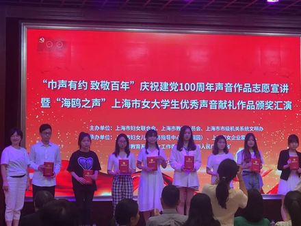 此前,我校在上海市妇联联合上海市教委开展“海鸥之声致敬百年”专题活动中表现突出,分别荣获一个二等奖,一个三等奖。在建党百年之际缅怀先烈,为女大学生提供了表达情感的平台,带领女大学生把个人理想追求融入实现中国梦的伟大实践,做伟大事业的建设者、做文明风尚的倡导者、做敢于追梦的奋斗者,在全面建设社会主义现代化国家新征程上,为实现中华民族伟大复兴的中国梦作出更大贡献。