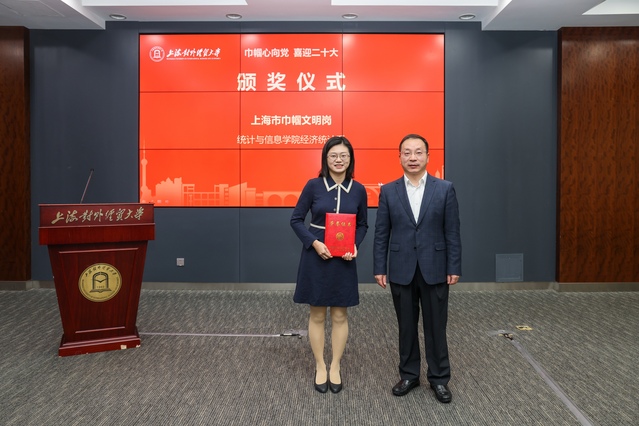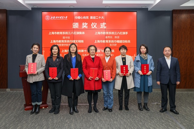 校妇工委主任、工会女工委主任彭清清宣读了表彰决定,统计与信息学院经济统计系荣获“上海市巾帼文明岗”荣誉称号,图书馆荣获“上海市教育系统三八红旗集体”荣誉称号,工商管理学院学工团队荣获“上海市教育系统巾帼文明岗”荣誉称号,姜秀珍、陈坚两位同志荣获“上海市教育系统三八红旗手”荣誉称号;张天舒同志荣获“上海市教育系统巾帼建功标兵”荣誉称号;赵霞、蒲玮夫妇荣获“上海市教育系统第十三届比翼双飞模范佳侣”荣誉称号,马木兰、邓涛涛夫妇荣获“上海市教育系统第十三届比翼双飞模范佳侣提名奖”;会计学院ACCA中心等四个集体荣获校级三八红旗集体和巾帼文明岗荣誉称号,陈晓静等五位同志荣获校级三八红旗手和巾帼建功标兵荣誉称号。