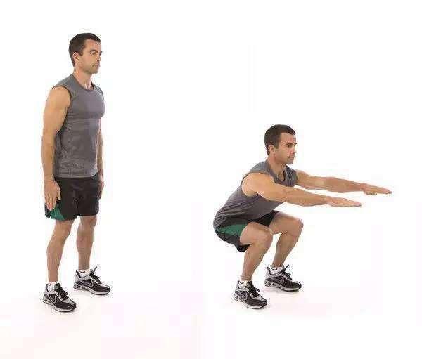 两脚平放于地面,打开与肩同宽,注意背部呈弓形。然后下蹲,蹲到臀部低于膝盖,大腿部平行于地面。站起时重心向后倾,脚跟发力站起。