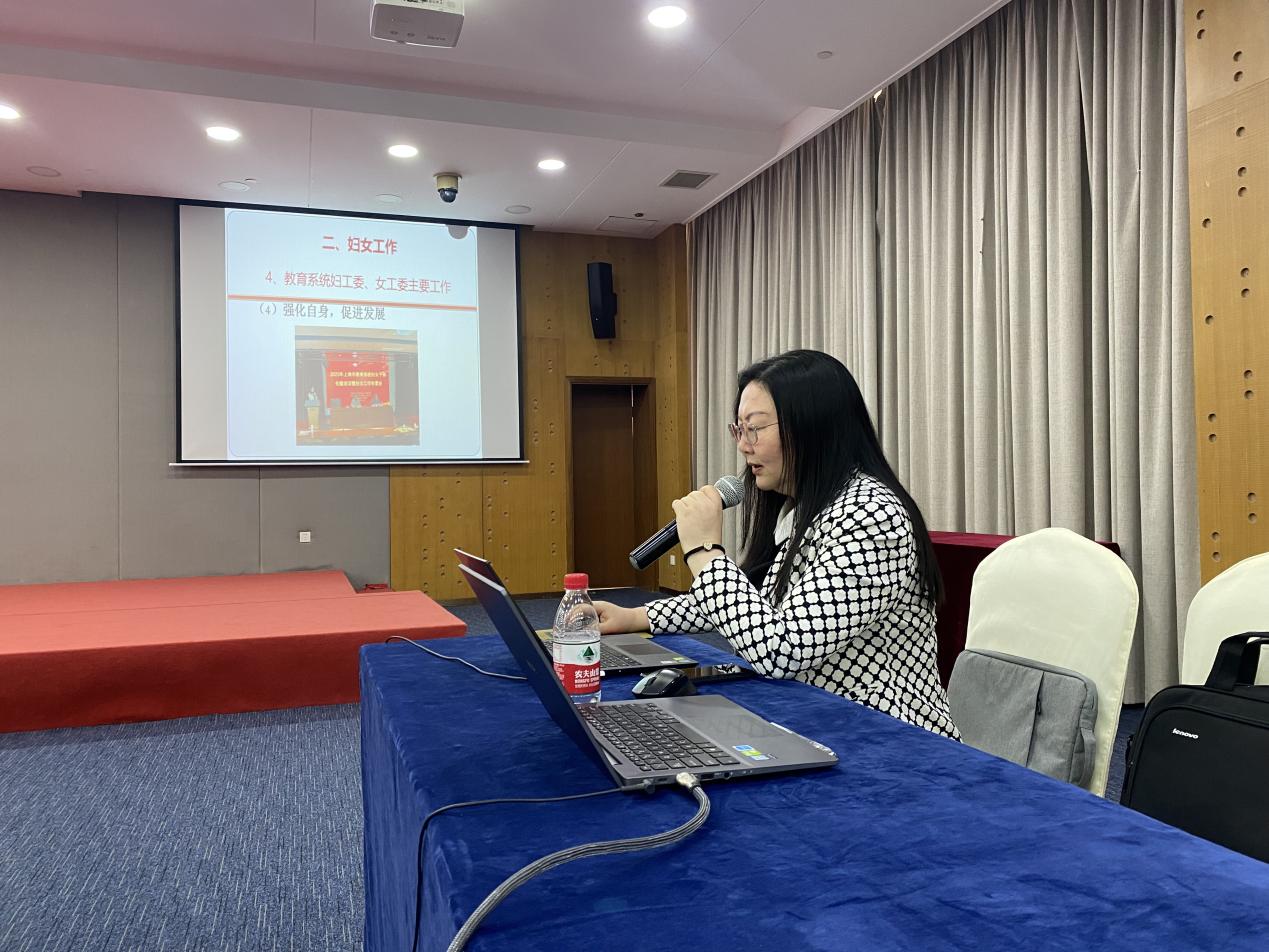 上海市教育系统妇工委副主任张芳为参加培训的工会干部做了妇女工作实务的培训。张芳介绍了妇女组织、妇女工作(与妇联和市总女职工委员会相关的)特点和总体情况以及教育系统妇女组织近期计划开展的主要工作。同时,她传达了上海市第十六次妇女代表大会精神。她强调是妇工委的工作目标就是把教育系统妇女组织建设成为党开展妇女工作的坚强阵地,深受广大女教职工信赖和热爱的温暖之家。