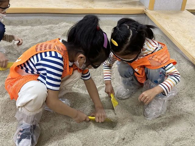 学完了考古工具,孩子们在考古老师的指导下使用专业挖掘工具,自己进行考古体验,挖掘自己的专属“文物”。挖掘之后,进行测量、登记、存放。