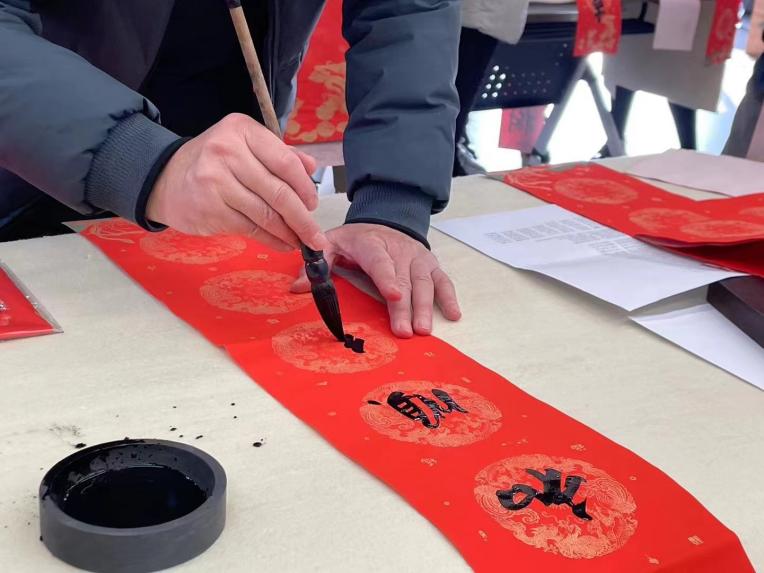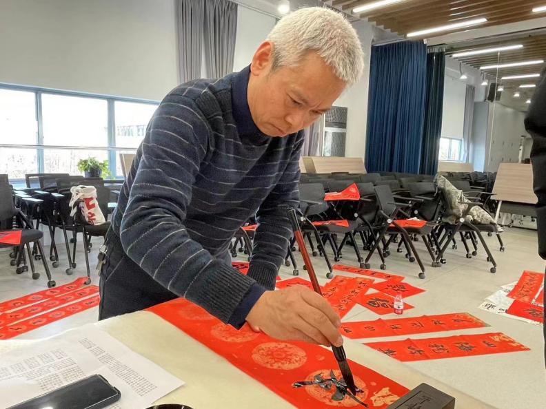 活动中,书画协会的老师们神情专注,热情洋溢地在鲜红的春联纸上挥毫泼墨,一停顿、一落笔、一张张红纸、一句句祝福,散发着清新墨香的春联融入了喜庆和热情,带着对美好节日的憧憬,为即将到来的新年增添喜气。