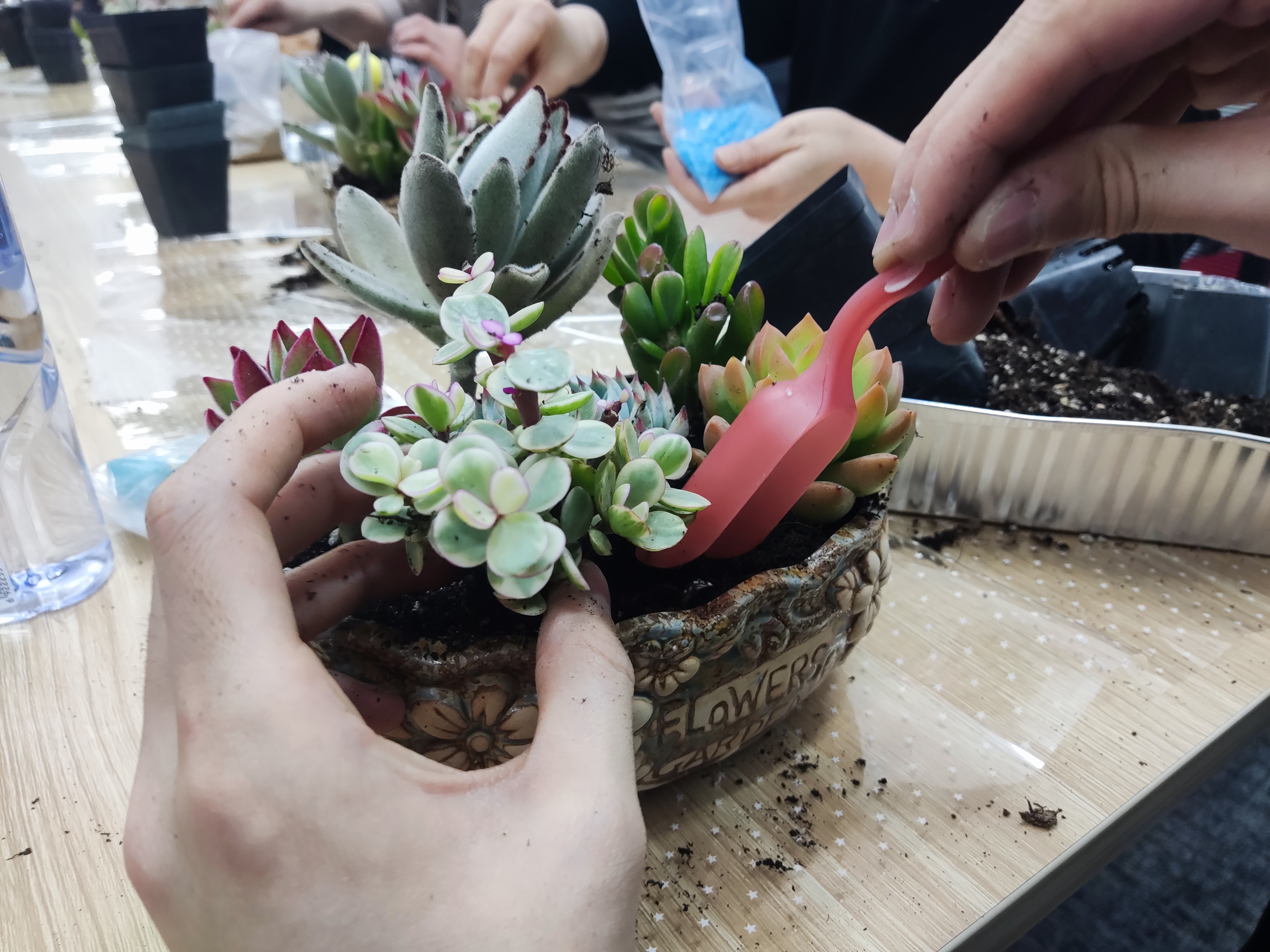 将营养土放入盆器中铺放平整,将不同品种的多肉植物穿插着搭配在一起,逐步完成铺设、培土、装饰等步骤。每个人都发挥着自己的创造力,在职工们的巧手装点下,一盆盆各具特色的多肉"小花园"相继呈现,大家成就感满满!