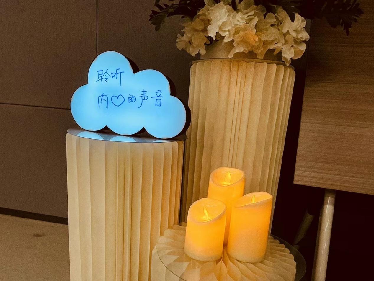 活动现场布置温馨而宁静,柔和的灯光洒在每个人的脸上,营造出一种轻松愉悦的氛围。伴着颂钵辽远、手碟悠扬、风铃清澈、雨声淅淅、流水潺潺的音声,老师们的思绪随音而动,进入了冥想状态,体验深层放松的舒畅与宁静,自然的亘古音波穿透身体,激活内存的生命力,释放紧张、焦虑等负面情绪,启动自我修复通道。