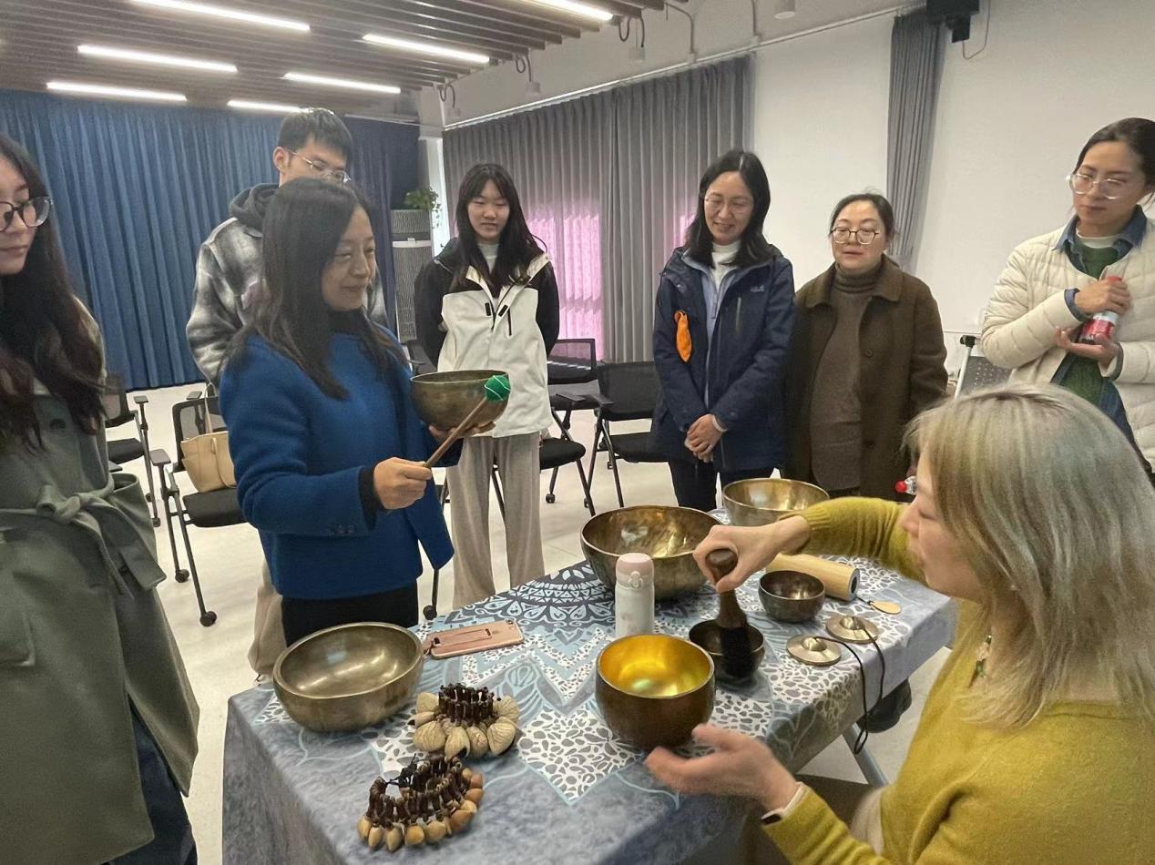 活动最后还设置了互动环节,老师们就音声的疗愈体验进行了分享和交流,同时在疗愈师的指导下,亲手体验了手碟与颂钵的演奏,感受了音乐带来的治愈力量。老师们纷纷表示,通过亲身实践,她们更加深刻地体会到了音声疗愈的魅力,得到了深层的放松,学习如何 感受当下,为心灵解压,寻找最初的纯真,并计划将这一方法融入到日常生活中,以助于保持良好身心状态。